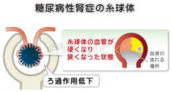 糖尿病性腎症の基本説明です。血管が狭くなることで腎症が起こることをイラストとともに説明します。n-01617/腎臓/泌尿器科/病気の概要/糖尿病性腎症/糖尿病性腎症とは/糖尿病性腎症とは/