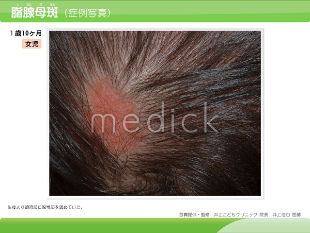 脂腺母斑の症例写真です。生後より頭頂部に脱毛部を認めていたものです。 sh-00721/小児科/皮膚...
