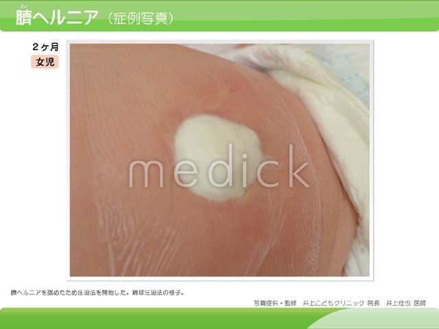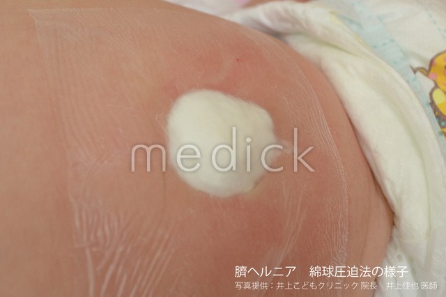 臍ヘルニアの症例写真です。綿球圧迫法の様子です。 sh-00736/おなかの病気/小児科/臍ヘルニア...