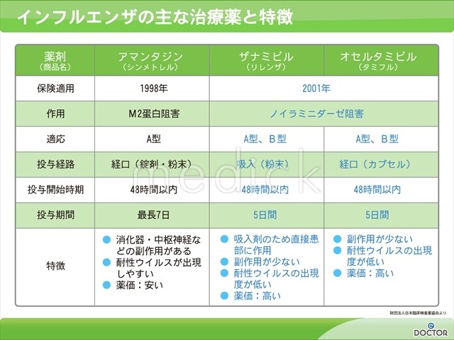 インフルエンザの主な治療薬と特徴の説明スライド