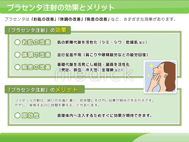 プラセンタ注射の効果(肌、体調、疾患の改善)とメリットについて説明します。 bi-00075/肌/プ...