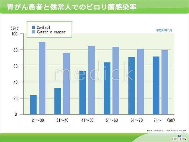 若い人ほど胃がん患者にピロリ菌感染率が高いことを示します。n-00475/胃/消化器/胃がん/胃がん...