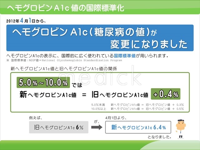 ヘモグロビンA1c値(HbA1c)の国際標準化(NGSP)されたことを説明します。n-01106/代...