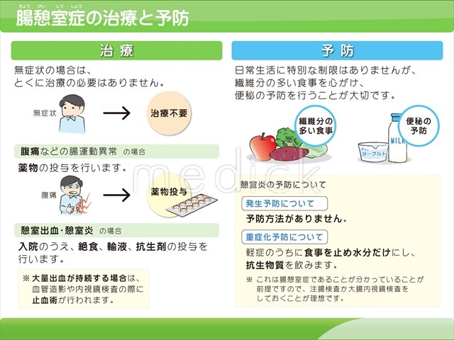 腸憩室症の治療と予防について治療は無症状の場合は治療の必要ががないことなどイラストを交え説明します。...